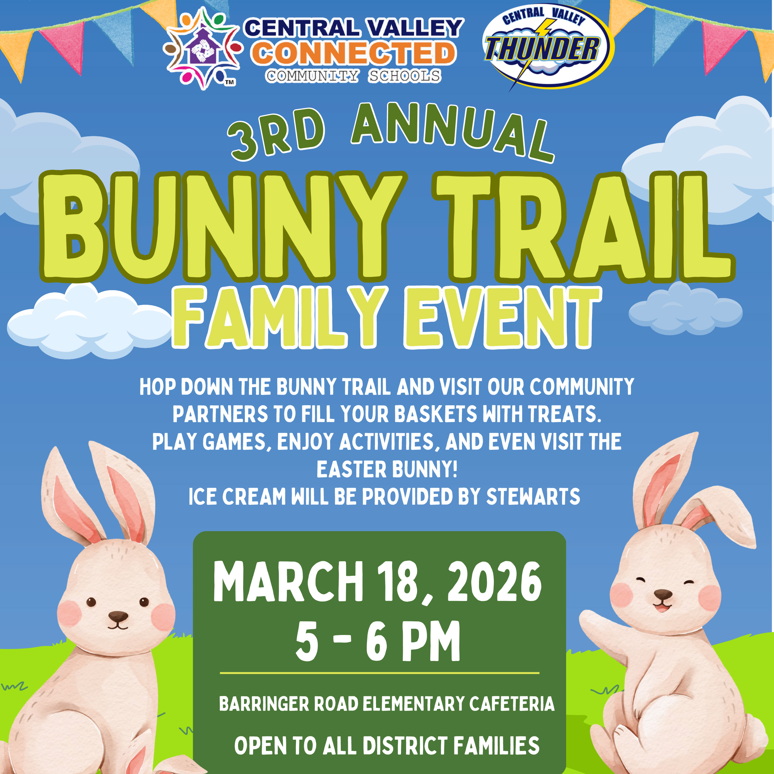 All Central District CSD families are invited to Connected Community School's free "3rd Annual Bunny Trail Family Event" 5- 6 p.m. on Wednesday, Mar. 18 in the Barringer Road cafeteria. Bring a bas...